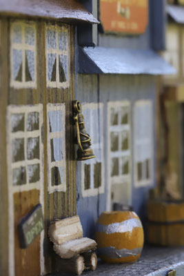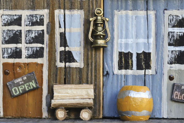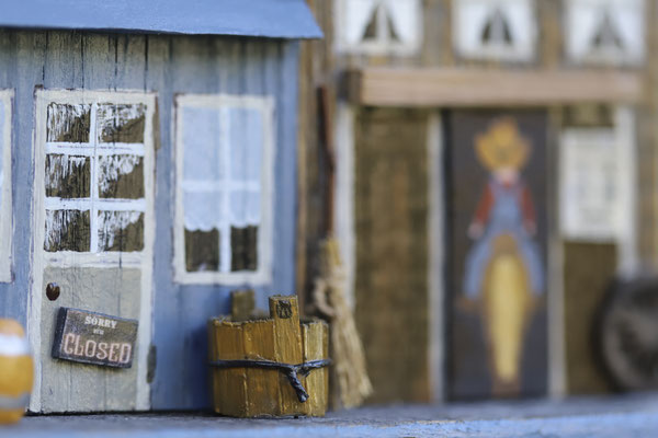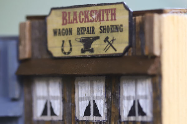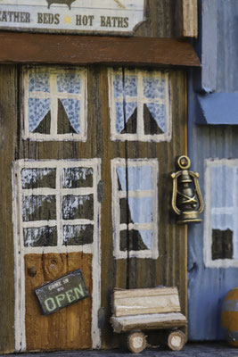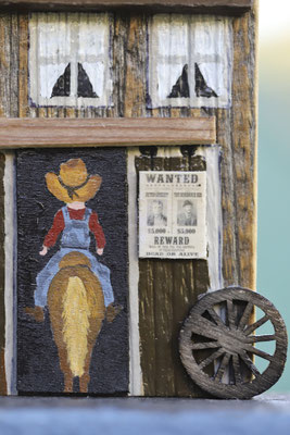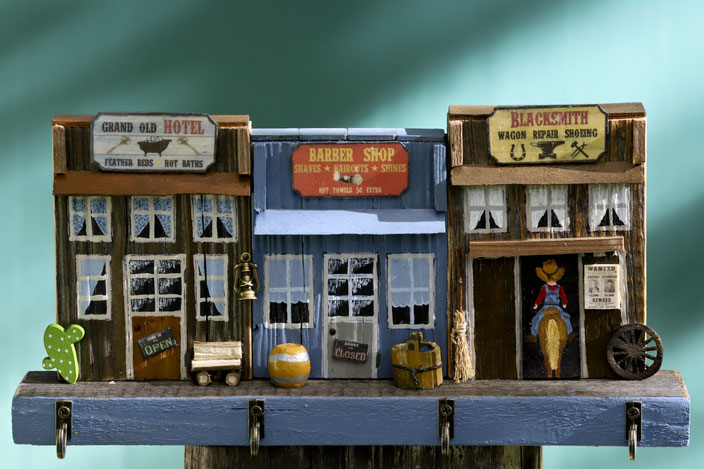 Im Silhouetten-Stil liebevoll handwerklich gestaltete Western-Häuschen (Hotel, Barber Shop, Blacksmith), dekoriert mit handgemachten Schildern, Bank, Fass, Wasserkessel und Besen.